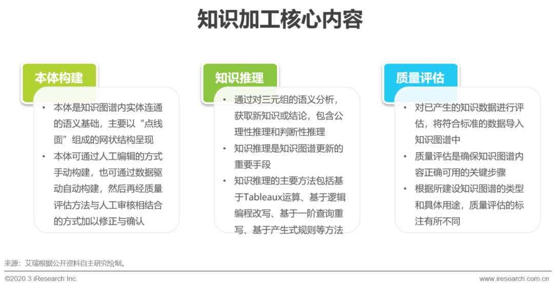 经过知识抽取和知识融合,实体和本体从信息源中被识别、抽取,并且消岐、统一,此时得到的关联数据是对客观事实的基本表达,但客观事实还不是知识图谱需要的知识体系,想要获得结构化的知识网络,还需要经过本体构建、知识推理和质量评估等知识加工过程。本体构建是知识图谱内实体连通的语义基础,以“点线面”组成的网状结构为表现形式,“点”代表不同实体,“线”代表实体间的关系,“面”既是知识网络。本体可以通过人工总结专家经验进行手动编程,也可以由机器学习驱动进行自动构建,本体构建的模型深度和广度,决定了知识图谱的应用价值;知识推理是通过对已有实体间关系的计算,找到新关联,从而丰富新知识的过程,也是知识图谱更新的重要手段;质量评估是知识加工最后的“质检”环节,确保经本体构建和知识推理得到的知识是合理,且符合知识图谱应用目的,根据所建设知识图谱的类型和具体用途,质量评估的标注有所不同。