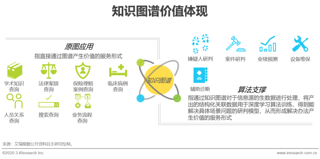 知识图谱作为一种更加形象的数据表现方式,其产品形式可以分为原图应用和算法支撑两类。原图应用是指直接通过图谱产生价值的服务形式,图谱根据概念层和数据层的区别可以分为通用知识图谱和行业知识图谱,通用知识图谱信息一般来自开放的互联网,三元组多为具有普适性的常识知识,知识覆盖的广泛性越强,价值越凸显,其特性更适用于如谷歌、百度、搜狗等百科型搜索引擎,被视为下一代搜索引擎的核心技术。而行业知识图谱则更看重具体场景中的认知深度,以及与行业know-how的结合程度,在此基础上实现的知识检索、隐藏关系挖掘和缺失数据补足,能很好地满足垂直领域知识类查询的需求,例如企业业务流程查询、司法领域案例查询、警务领域嫌疑人关系查询等;算法支撑是指通过知识图谱对于信息源的生数据进行处理,将产出的结构化关联数据用于算法模型训练和应用,得到能解决具体场景问题的研判建议,从而形成解决办法产生价值的服务形式。结合垂直行业B端市场的需求特点,由知识图谱作为算法支撑的智能解决办法具有更凸显的市场价值和更广阔的想象空间,用于投研投顾、辅助断案、业绩预测等偏向于认知智能的服务,是以知识图谱和算法能力见长的数据智能服务公司应有的核心竞争力。