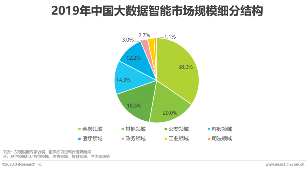 据艾瑞咨询统计推算,2019年涵盖大数据分析预测、领域知识图谱及NLP应用的大数据智能市场规模约为106.6亿元,预计2023年将突破300亿元,年复合增长率为30.8%,其中2019年市场中以金融领域和公安领域应用份额占比最大,金融领域因标准化数据积累丰富,行业认知与直接需求最为明显等因素,成为数据智能最早落地并产生价值的行业;公安领域经过三年的感知智能基础设施建设,已经初步形成人工智能应用环境,在党中央和公安部的号召指导下,公安大数据建设将成为下一阶段的主题,这一趋势也在2019年相关招标项目中得以体现。随着整体市场数据基础的完善和需求唤醒,大数据智能领域规模持续走高,但在行业可落地性和理性建设的限制下,预计市场增速将呈现下降趋势,期间咨询性需求将会大量出现,从整体发展来看增速处于良性区间,对真正有价值的公司和产品有正向意义。