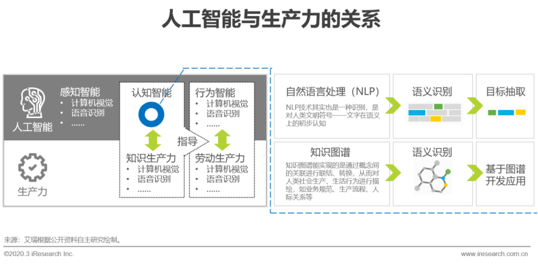 人工智能本质是解决生产力升级的问题,人类生产力可以归类为知识生产力和劳动生产力,人工智能走入产业后,可以分为感知智能、认知智能和行为智能,后两者更与生产力相对应,NLP和知识图谱是发展认知智能的基础。