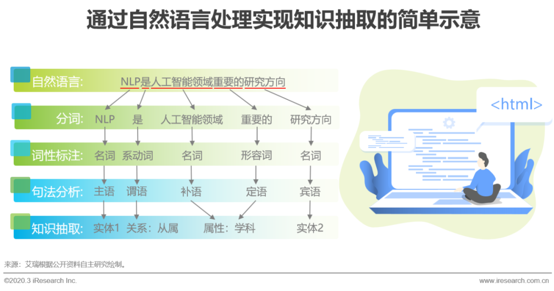 自然语言处理(NLP)是一门涉及语言学、数学和计算机科学的综合学科,主要研究人与计算机之间使用人类自然语言进行有效沟通的理论和方法。NLP技术包含非常广泛,最常应用于知识图谱中的能力是对于自然语言中信息的抽取,基本能力包括分词、词性标注和句法分析,通过词典法或统计法将文章中的词语进行分割,由最大熵、HMM或CRF等算法训练模型,对名词、动词、形容词、标点符号等词性类别进行识别和标注,再根据规则法或统计法对语句的主谓宾等句法结构进行分析,得到完整句式,最终产出一个计算机可识别的语料库,供后续需求调取。NLP技术是人工智能领域最具有挑战性的任务之一,2018年10月,谷歌公布的BERT模型在11项NLP任务中表现卓越,将下游具体NLP任务近一步推向预训练产生词向量环节,增强了NLP的泛化能力和自动化能力,为业界带来了新的思考方向,随着训练模型的不断探索与开源,类似深度神经网络于识别类任务的里程碑型训练算法终将出现,届时NLP训练成本将大大降低,从而真正走向产业化,开启认知智能的大门。