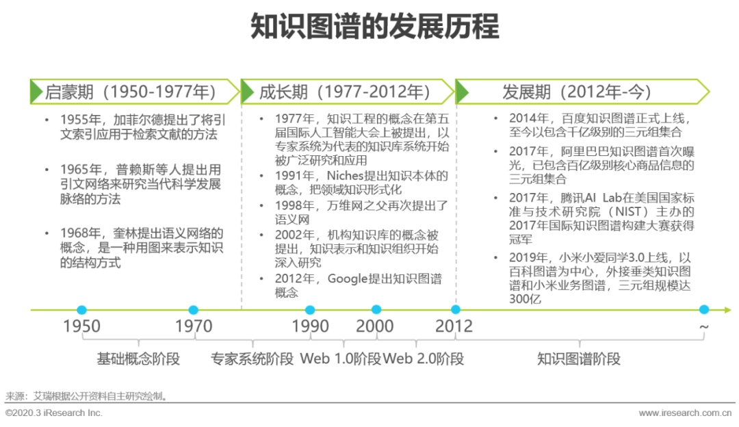 知识图谱发展至今可以总结为三个时期和五个阶段。1950-1977年是启蒙期,包含了基础概念阶段和专家系统阶段的开端,这一时期文献索引的符号逻辑被提出并且应用;1977-2012年是知识图谱不断演变的成长期,包含了大部分专家系统阶段和Web 1.0和2.0阶段,在此期间出现了很多如WordNet、Cyc、Hownet等大规模的人工知识库,知识工程成为了人工智能重要的研究领域,2012年,Google正式提出的知识图谱概念,开启了现代知识图谱的序章;2012年至今是知识图谱的发展期,中国企业开始入局,以BAT为代表的科技公司依托自身业务,在搜索引擎、电商、医疗等领域开始应用知识图谱技术,解决办法服务商们也从大数据赛道中脱颖而出,将知识图谱技术拓展到安防、金融、教育等更多领域,让AI跳出感知智能的商业局限,向解决各产业生产环节中的核心痛点更进一步。