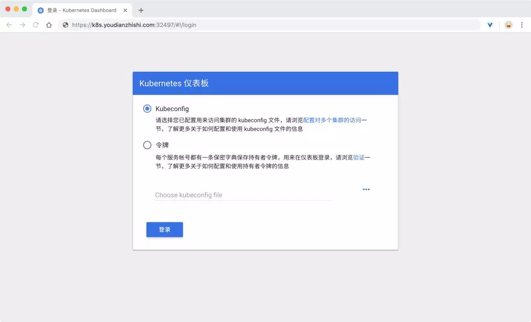 然后可以通过上面的 32497 端口去访问 Dashboard,要记住使用 https,Chrome不生效可以使用Firefox测试: