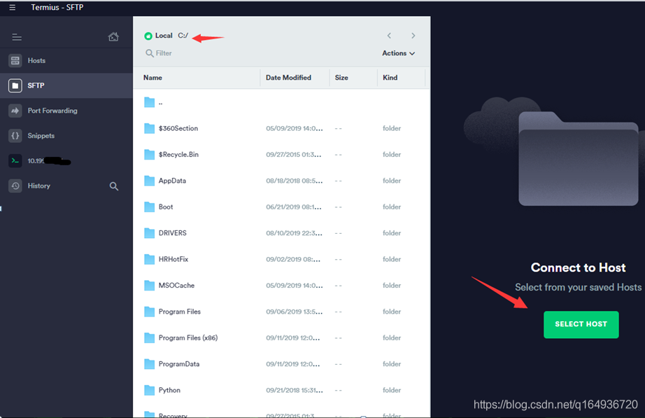 点SFTP按钮,弹出的页面左侧是本地主机的磁盘,右侧点【SELECT HOST】选择要传输文件的主机。