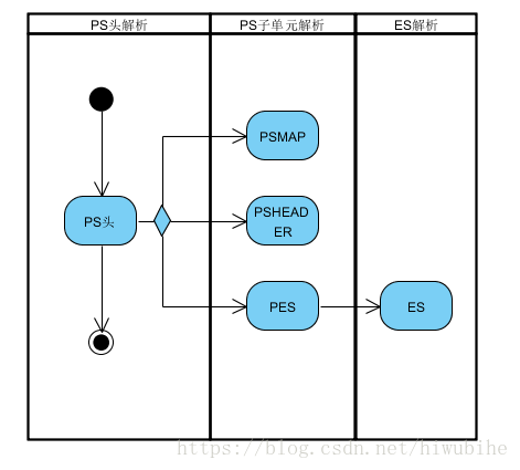 PS头表示一个PS打包单元,解析必须从PS开始,第一个PS头前面数据全部丢弃。找到PS头然后把PS头里面的子单元解析出来,子单元包括PS SYSTEM HEAD,PS MAP,PES等。PS SYSTEM HEAD,PS MAP解析作为该PS流的解码显示参考信息,再解析PES获取当前PS头里面的所有ES,送入不同解码处理单元即可,流程大致如下: