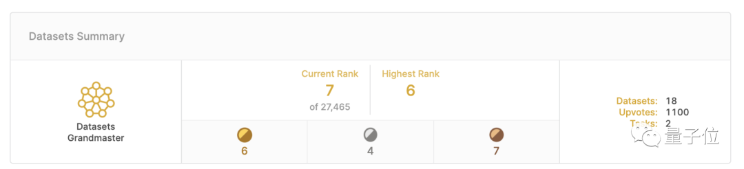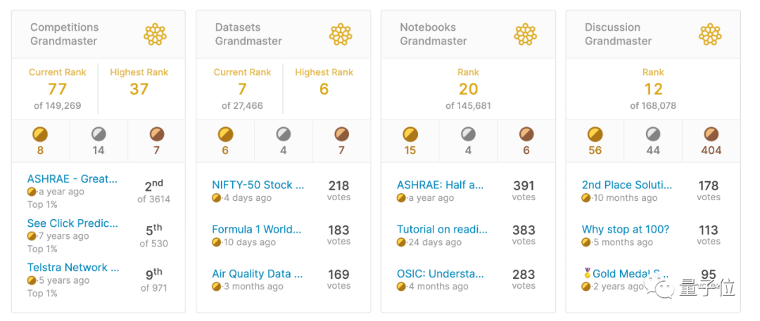 可以看到,他的金牌总数加起来就有84枚,其中Discussion上获得了56枚,数据集这一类别的排名术最高,在27466个选手中位列第7位,最高排名为第6位。