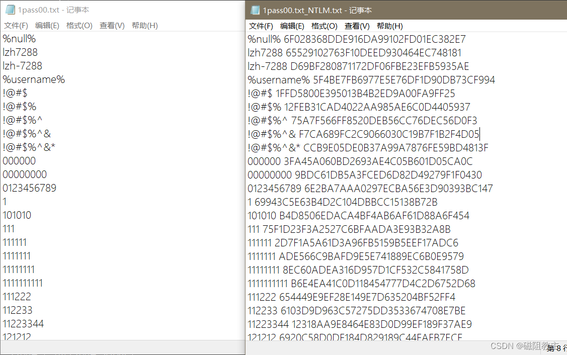 LC7这种含有NTLM字典破解功能的工具用起来感觉破解速度太慢了,不如直接将字典内的明文逐行生成一个新的包含明文与对应NTLM密文的专用字典,然后使用findstr指令查询快的多。