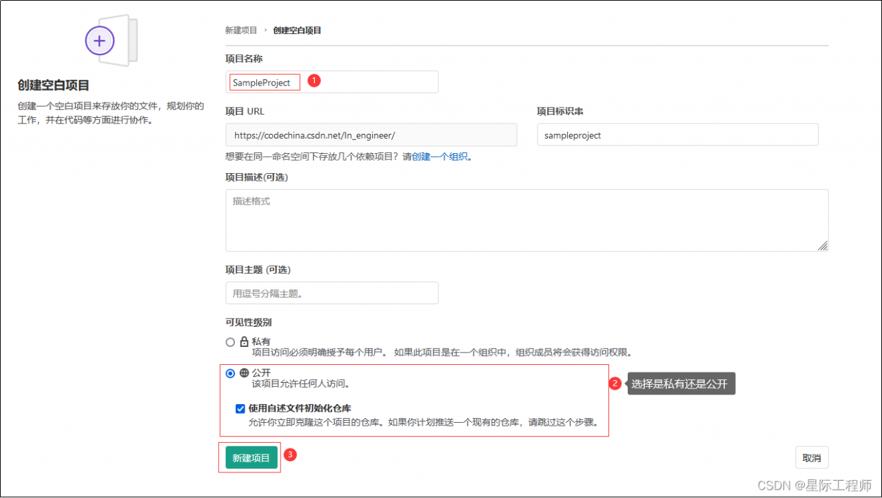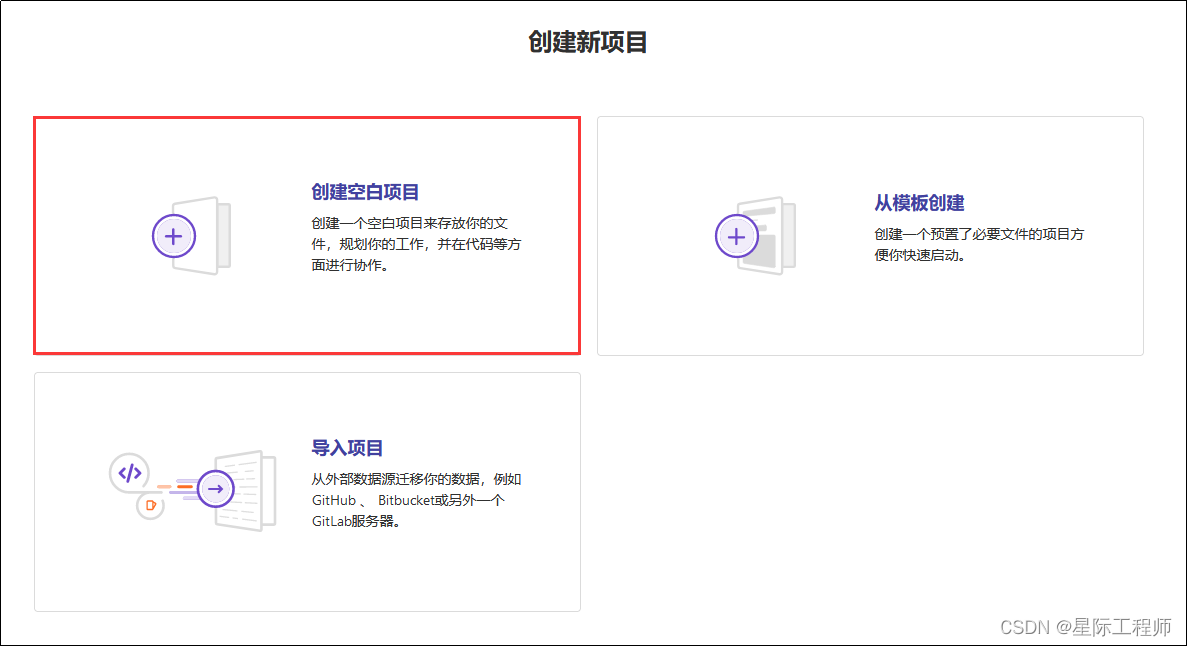| 1.点击个人主页右上角的“新建项目” | 2.这里我们创建一个空白项目,也可以选择从模板创建 |