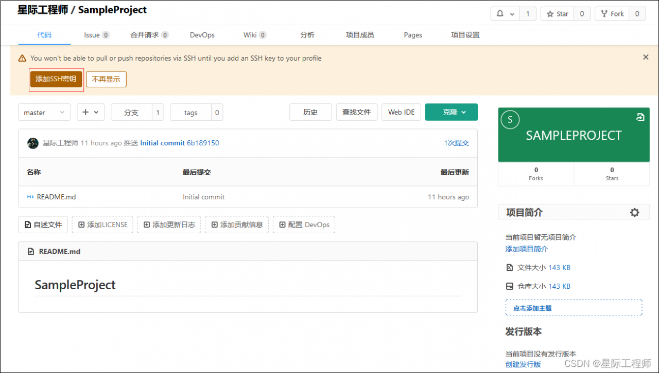 我们发现上面的SampleProject仓库主页提示我们添加SSH密钥,正常在工作开发中,本地仓库和远程仓库之间的数据传输都是经过SSH加密的,所以这里我们也添加一下SSH秘钥