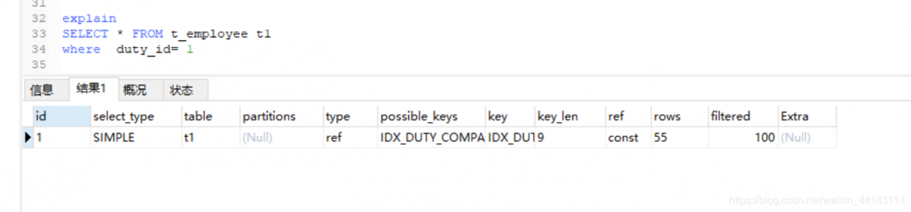 表最多有一个匹配行,const用于比较primary key或者unique索引。因为只匹配一行数据,所以很快。若只是使用limit 1 来返回1条数据,type不会是const。如图,