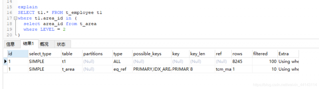 where子句用于限制哪一个行匹配下一个表或发送到客户。除非你专门从表中索取或检查所有行。如果extra值不为using where并且表示联接类型为ALL或index,查询可能会有一些错误。