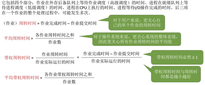 周转时间:从作业 被提交给系统 (外存) 开始,到 作业完成 为止的时间间隔。