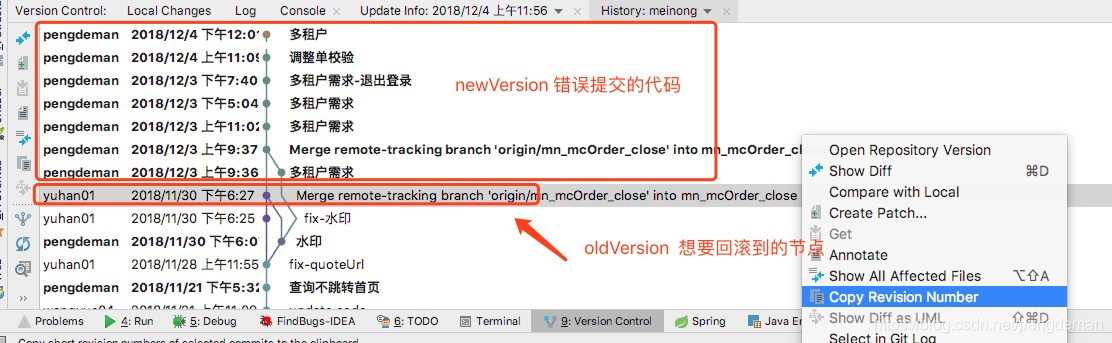 2. 选择oldVersion版本右键点击“Copy Revision Number”复制oldVersion版本的版本号: