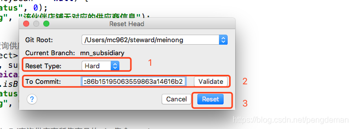 b. Reset Type项选择Mixed, To Commit项填写最新提交记录版本号(切记是最新分支的版本号newVersion分支);然后点击Reset按钮