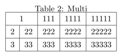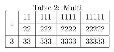\multicolumn{2}{|c|}{1} & 111 & 1111 & 11111 \\