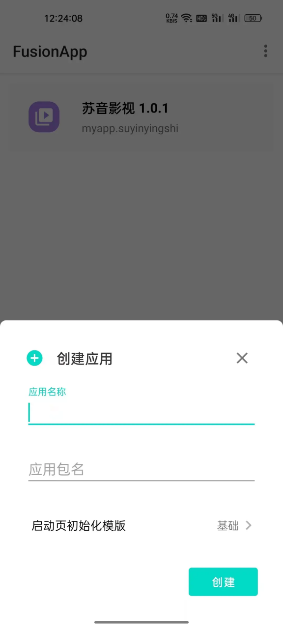2.输入自定义应用名称,下面的应用包名会自动填写,不用管。点击创建即可。