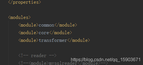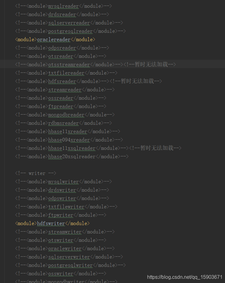 在DataX-master根目录下的pom.xml文件将核心组件、公共组件、reader/writer插件都以module的方式组装到一起,把不需要的注释掉就行了。