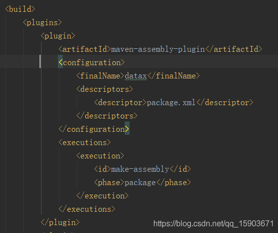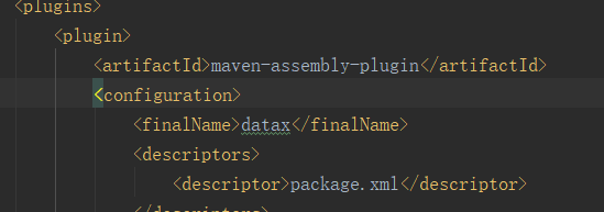 在pom.xml文件的下方可以看到plugin标签里定义了maven-assembly-plugin插件来辅助打包,指定package.xml文件为描述文件