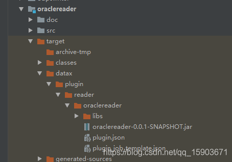 看一下oraclereader的目录结构,directory标签指定的oraclereader/target/datax路径下其实就是一个plugin文件夹。也就是说这个plugin文件夹打包时会被拷贝到 target/datax/datax/这个路径下面,当然plugin里面的东西会一并打包进来。
