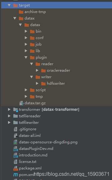 我们来看一下跟pom.xml同目录的target目录的结构。plugin里找到oraclereader和hdfswriter,没有其他插件,目的达成。