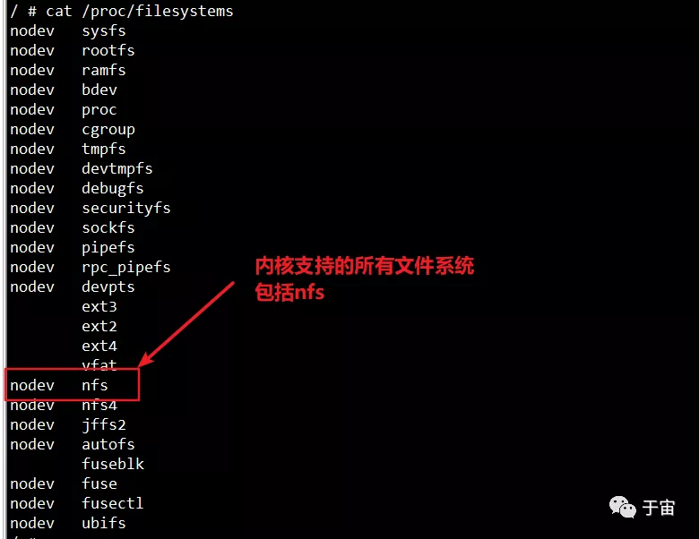 查看开发板kernel是否支持NFS,使用cat /proc/filesystem命令,检查是否有NFS一行,如下图所示。