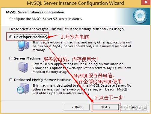 3、选择服务器类型,“Developer Machine(开发测试类,mysql占用很少资源)”、“Server Machine(服务器类型,mysql占用较多资源)”、“Dedicated MySQL Server Machine(专门的数据库服务器,mysql占用所有可用资源)”