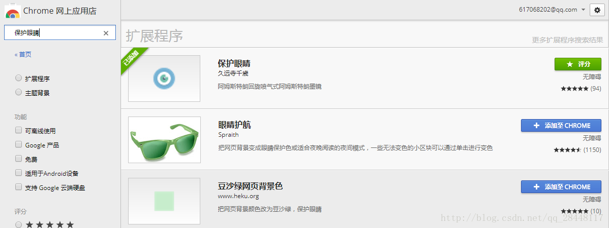 三:搜索“保护眼睛”我用的是第一个,很好用,或者也可以搜索“Apple Green”可以看到更多类似的插件。点击添加至Chrome