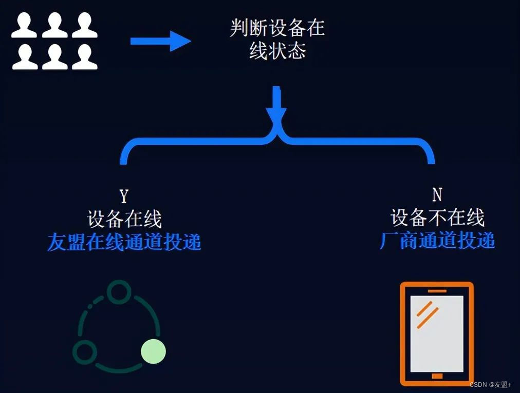 U-Push产品具备手机设备在线状态实时接口功能,能判断用户设备的在线状态:对于在线设备,通过友盟+在线通道投递;对于离线设备,则通过厂商通道投递。通过差异化消息推送,最大化在线通道投递量,节约厂商通道推送配额和费用。