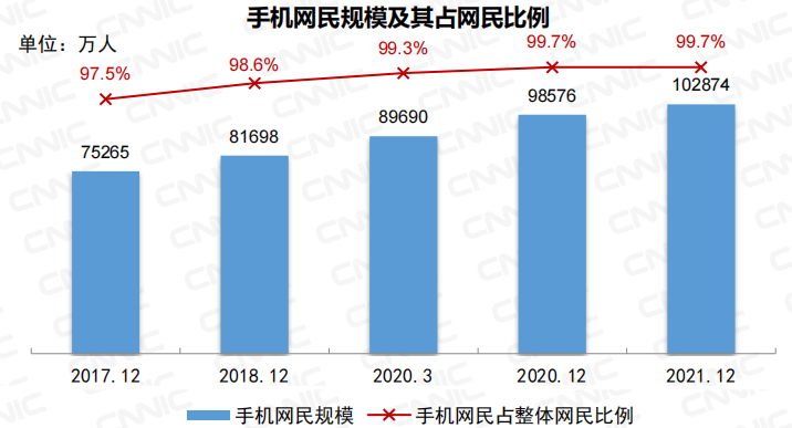 截至2021年12月,我国手机网民规模为10.29亿,网民中使用手机上网的比例为99.7%,手机用户规模见顶。可以说,手机用户大规模增长的时代已经一去不复返了,因而中国移动互联网将进入惨烈的存量搏杀阶段。