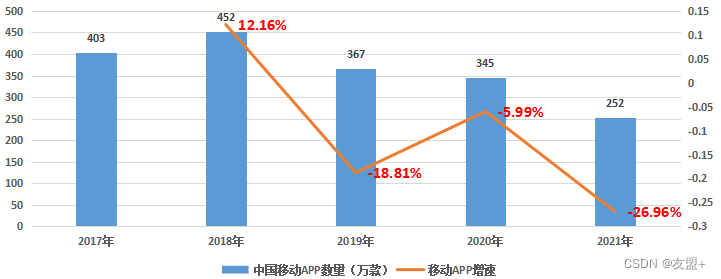 移动互联网的寒意,正在席卷整个行业。目前,移动APP的生存已经变得日益艰难。截至2021年12月,我国国内市场上监测到的APP数量为252万款,相比2020年下降超过93万款。事实上,移动应用APP总量从2018年就开始在不断下降了。中国移动APP的数量,从2018年巅峰时期的452万,降低到2021年的252万。两年时间,有200万移动APP都消失不见了,市场的惨烈程度可见一斑。