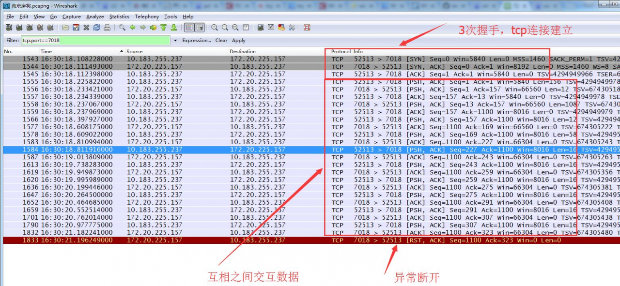 服务端端口是7018,和客户端建立socket连接,根据服务端的端口找到2者通信的所有socket数据(客户端进入房间后会异常断开,判断是客户端导致的还是服务端导致的)