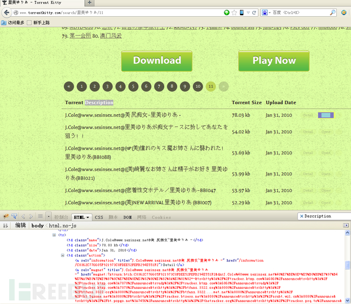 貌似这货拍了200多部,真不少。人工学习了下,torrentkitty的种子貌似还是蛮全的。搜一下关键字11页,接近200+个结果,这一个一个ctrl+c ctrl+v这不得直接导致键盘+鼠标手。祭出FIREBUG+PYTHON,写个爬虫把地址全部搞出来。因为目的比较单纯和纯洁,所以就不用SCRAPY这么大型的东西了。效率第一。