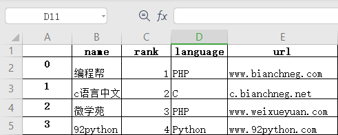 writer.save()上述代码执行后会自动生成 website.xlsx 文件,文件内容如下: