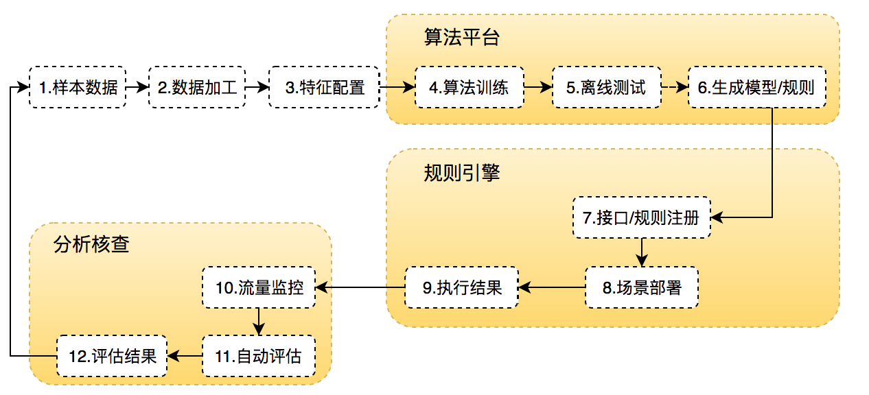 因此,仅聚焦在引擎与算法平台的联动上,可通过建设调度模块实现:1.训练样本预处理–>2.算法平台对接–>3.自动化生成接口–>4.自动注册接口/策略至引擎–>5.评估任务启动–>6.评估结果处理(策略上下线、样本数据沉淀)–>1.训练样本预处理的闭环流程。