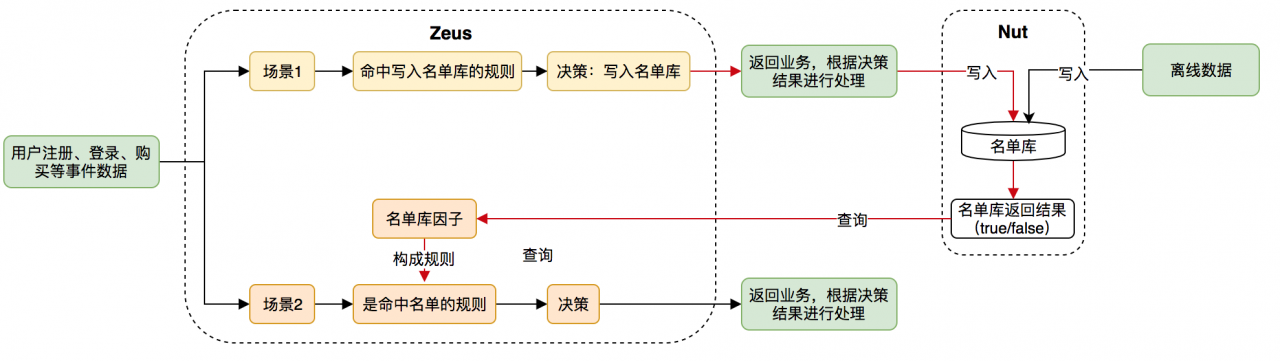 业务已经可以实时获得风控的决策,但发现风险用户会在很多场景下重复攻击。对这类用户的处理,除了对当次行为阻断,还要阻断其未来的行为,因此就有名单管理的诉求。我们通过与名单库的联动,提升该类用户的处理效率。