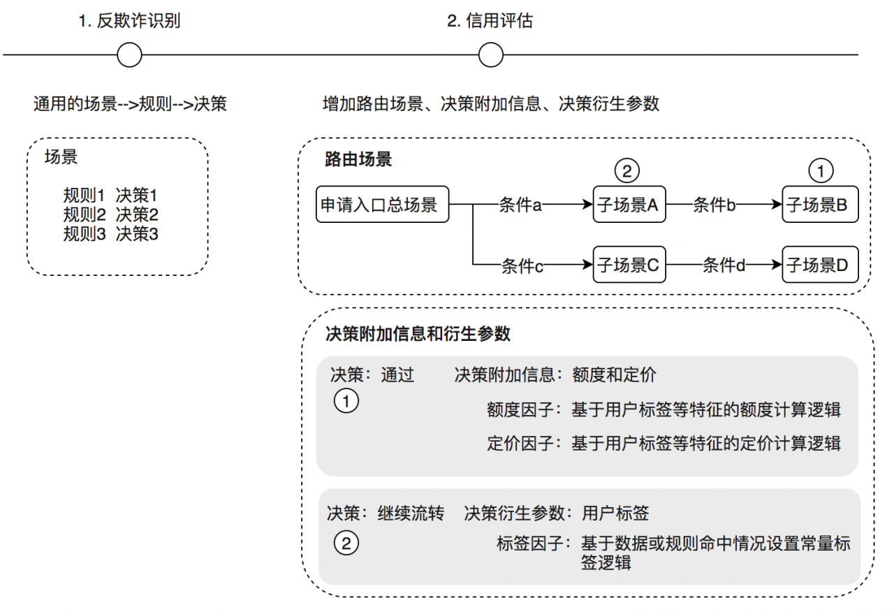 - 路由场景:可支持多层,决策流模式,即一堆规则的集合,支持按照逻辑进行分流,满足指定条件可以指定走向在每个节点进行条件设置,实现最终流向。例如:对于某分期场景用户申请一笔贷款,需要经过欺诈识别、信用评估后方可给出最终的额度、定价。