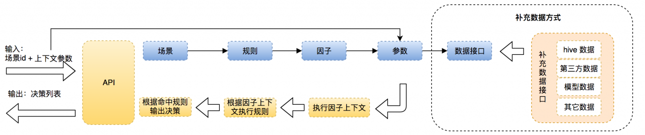 除了上面介绍的统一接入外,还有一种常见的情况:业务无法在发起请求时就将执行所需要的全部参数准备好,此时就需要引擎能主动获取外部数据。针对这类情况,规则引擎通过数据接口的方式实现了外部数据的补充,在策略执行时根据计算需要动态获取相关的参数。在实现与外部数据联动的功能后,大大降低了使用规则引擎业务方数据准备阶段的压力,从全部参数准备简化为仅提供核心参数即可,剩余参数按需引擎自行调度即可。