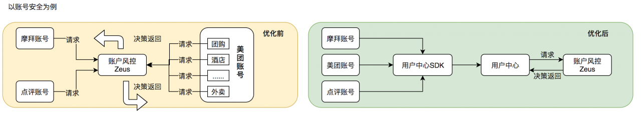 随着美团业务和场景种类的增多,现在也存在不经过通用节点的业务。因此,我们需要提供通用的接入接口,目前业务侧直接调用一个独立服务接口即可获得风控判断。