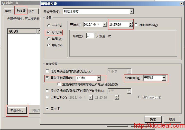 选择“触发器”选项,点击“新建”,创建任务执行时间,“重复任务间隔”这个选择后,后面有时间选择,是每小时,还是每分,可自己选择后再修改时间,再确定。