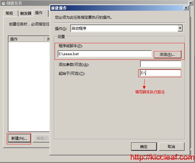 再来配置需要执行的“操作”,就是选择所写的程序或是BAT文件,这里很重要的配置是选择BAT文件后,在“起始于(可选)”这里一定要填写相应执行程序或是BAT文件的所在目录,要不然是执行不成功的。