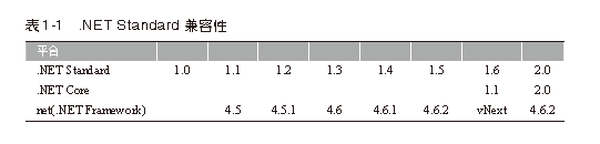表1-1 所示为截至本书写作时的 .NET Standard、.NET Core 以及现有 .NET Framework 的