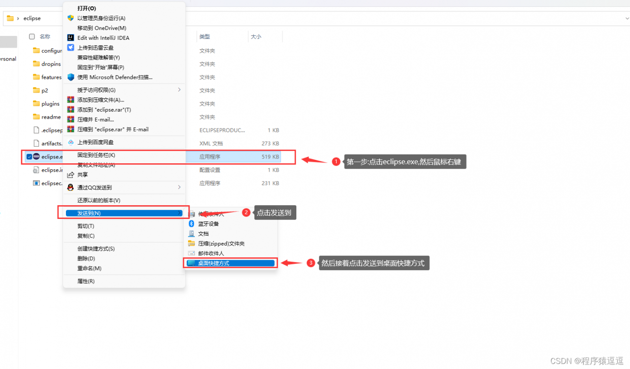 5.11 进入这个页面,第一步点击eclipse.exe,第二步鼠标右键点击找到发送到,第三步然后点击发送到桌面快捷方式
