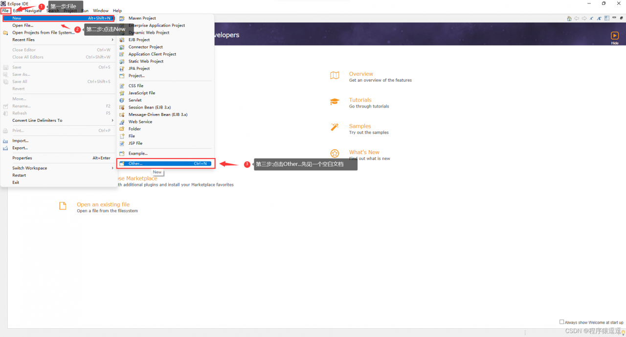 6.2 然后第一步点击File,第二步点击New,第三步点击Other去创建我们的第一个空白文档