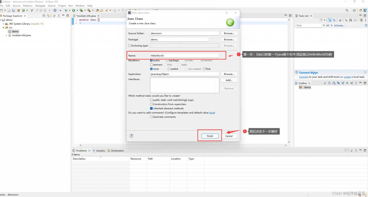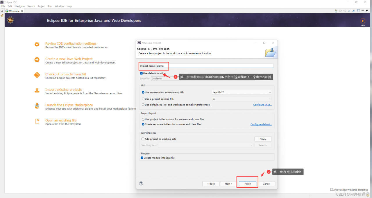 6.4 在红色框里为自己的第一个项目取名字,这里我取了一个demo为例