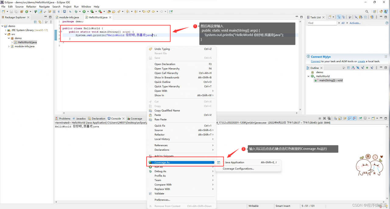 6.10 接着在红色框方法里里输入,然后鼠标右键点击Coverage As运行