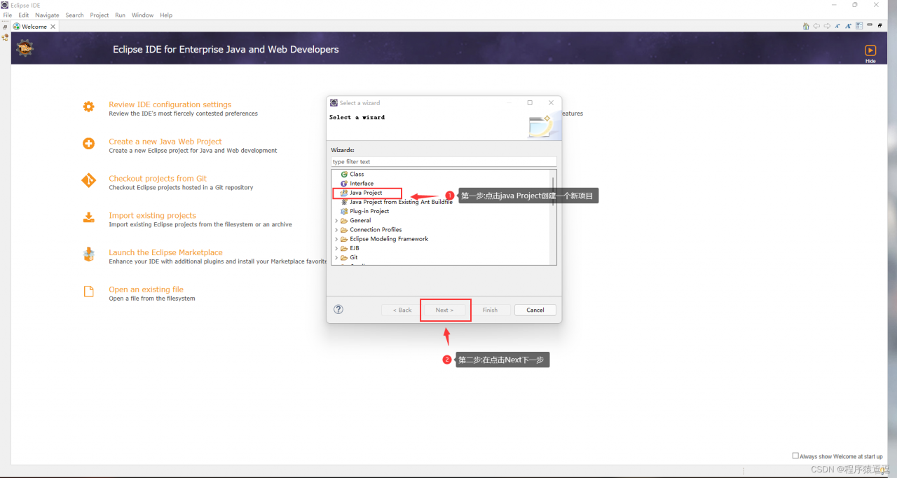 6.3 接着会弹出以下界面 然后点击java Project创建一个新项目,最后点击下一步