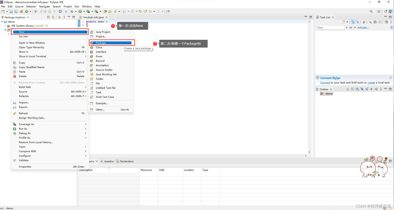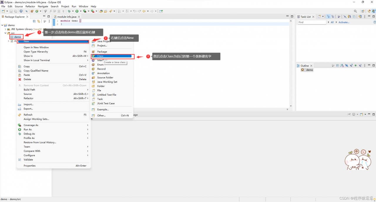 6.8 然后再点击包名demo,鼠标右键点击Class