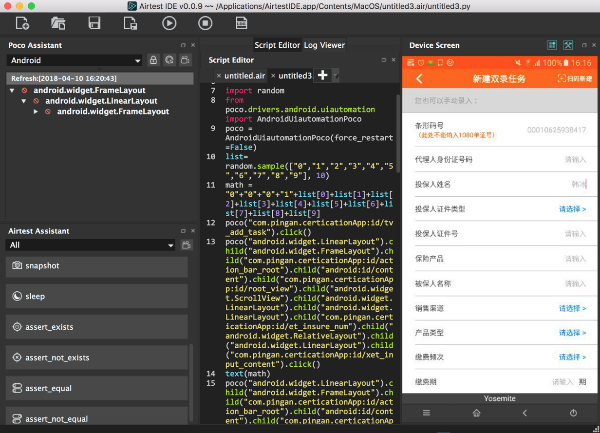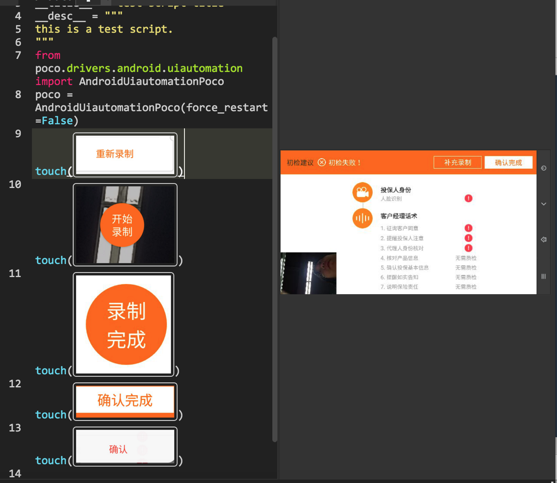 那么问题来了,怎么样才能够让Airtest也精准定位到输入框,从而完成自动输入信息类型的自动化测试呢?其实我们别忘了Airtest还有基于poco这个UI控件搜索框架,所以如果是Android类的app,还是比较适合用poco来定位控件的位置,从而实现自动化,下面有一个智能双录软件新建保单的测试用例: