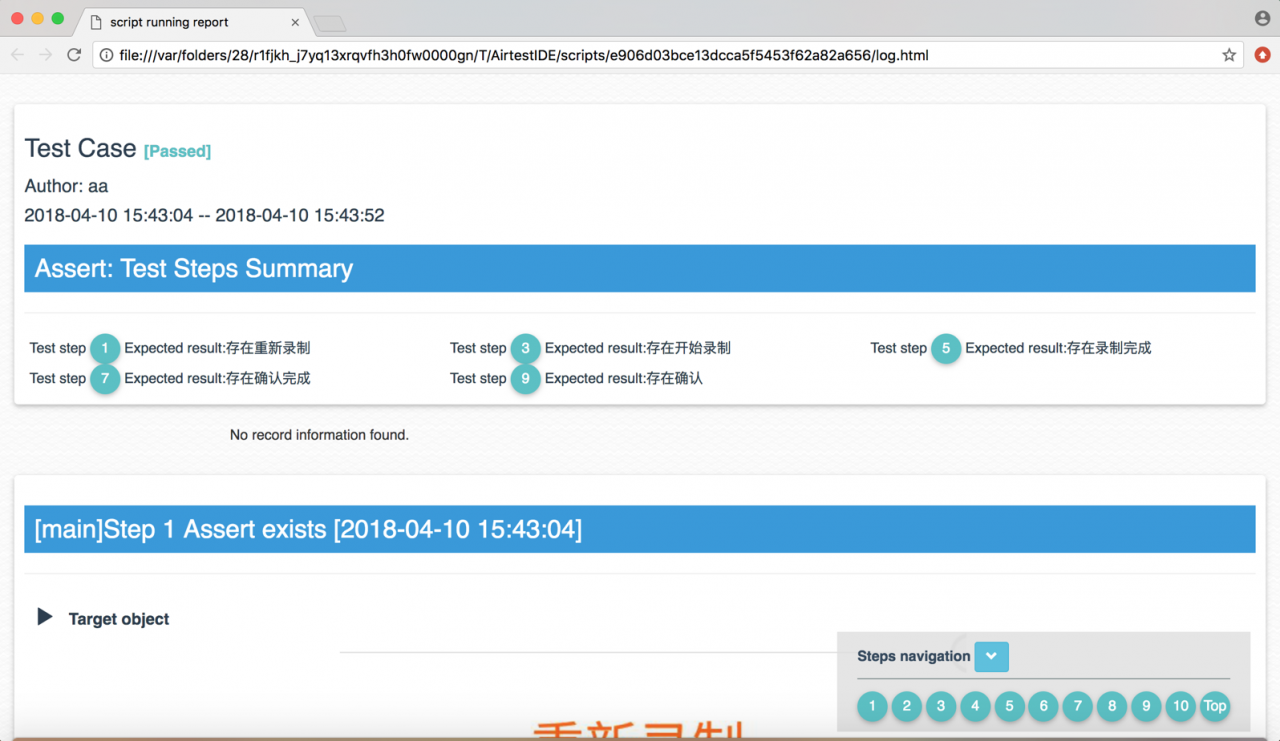 除了以上这些,我们还可以往脚本里面加入断言,然后利用Airtest一键生成测试报告,如图3所示,这种报告不仅可以让你快速了解到你测试的哪个步骤出错了,而且同时也便于判定UI有没有展示异常,但是Airtest有一个缺陷,就是只要某张图片识别不出来,整个脚本录制进程就会停止,后面的控件就不会再去识别,报告也只会停留在失败的那一步,生成报告可以点报告按钮或者ctrl+l,报告以网页的形式呈现,如下图: